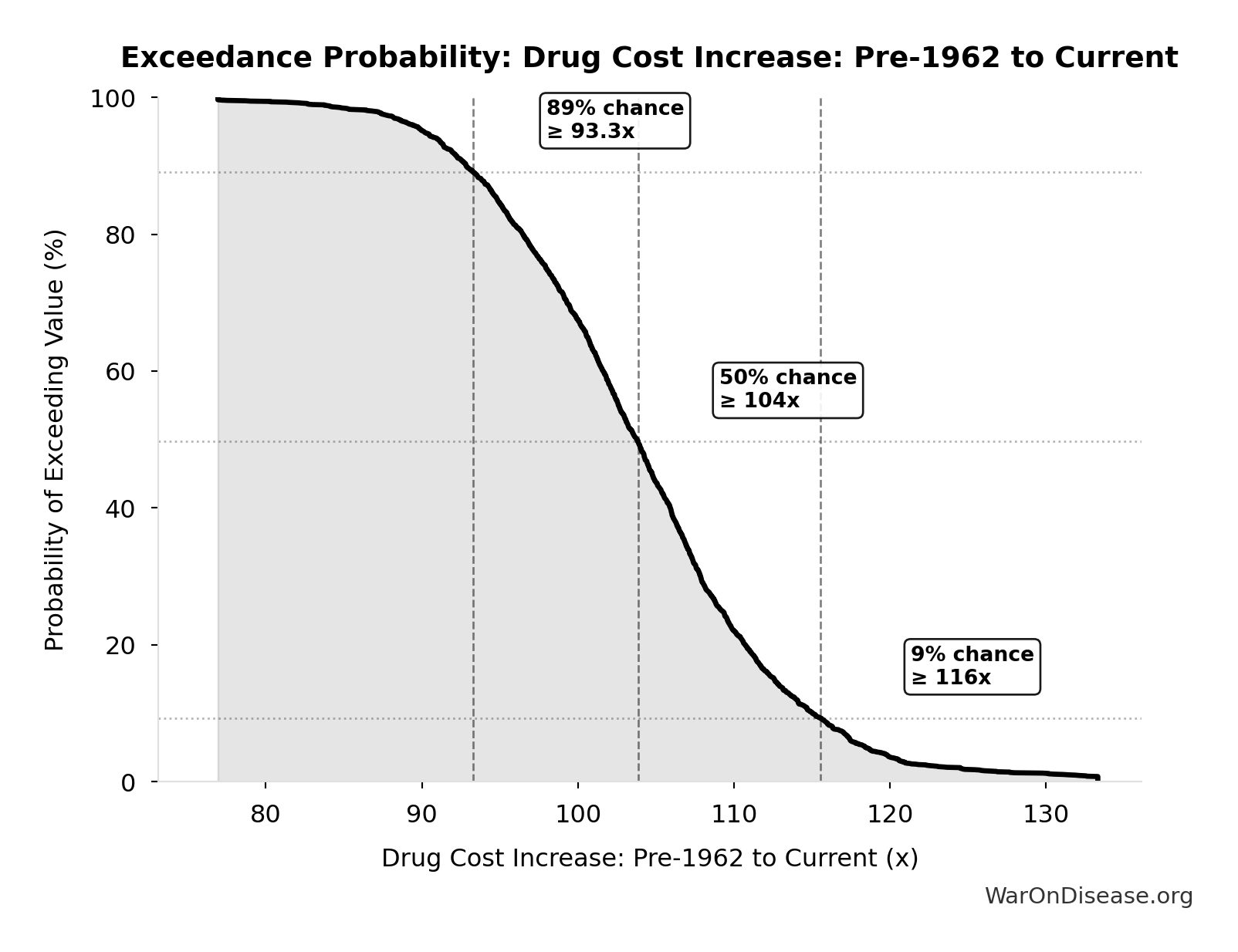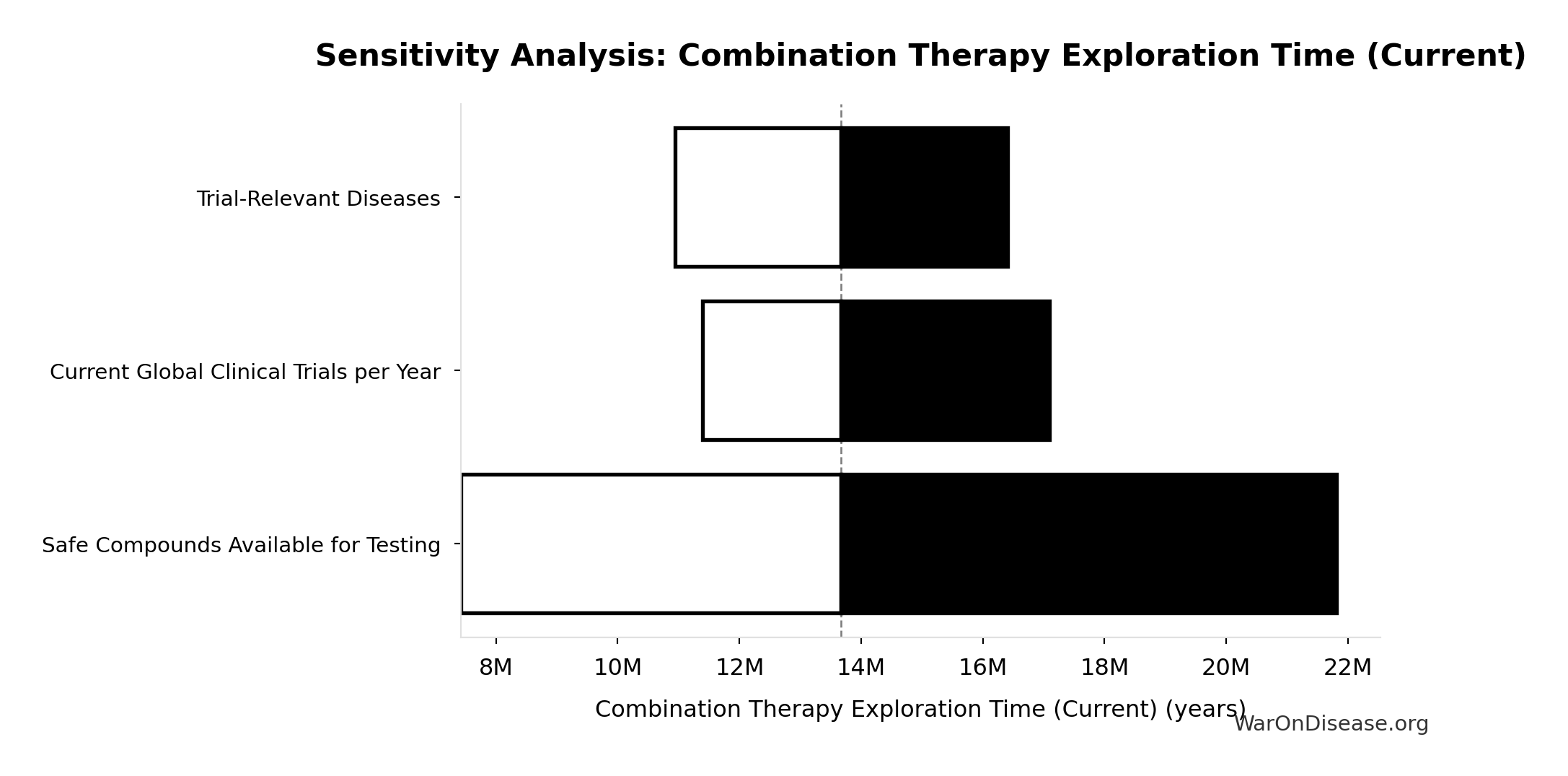 \[ \begin{gathered} T_{explore,combo} \\ = \frac{Space_{combo}}{Trials_{ann,curr}} \\ = \frac{45.1B}{3{,}300} \\ = 13.7M \end{gathered} \] where: \[ \begin{gathered} Space_{combo} \\ = N_{combo} \times N_{diseases,trial} \\ = 45.1M \times 1{,}000 \\ = 45.1B \end{gathered} \] ✓ High confidence