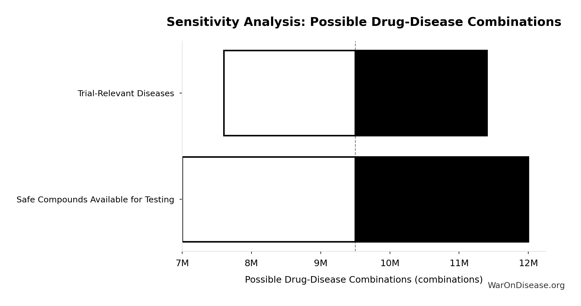 - Safe Compounds Available for Testing: 9.5 thousand compounds (95% CI: 7 thousand compounds - 12 thousand compounds)