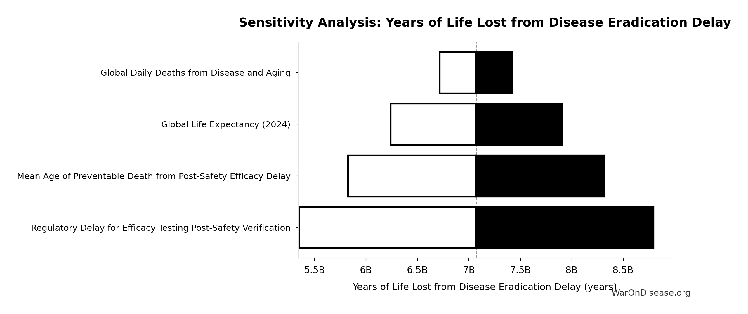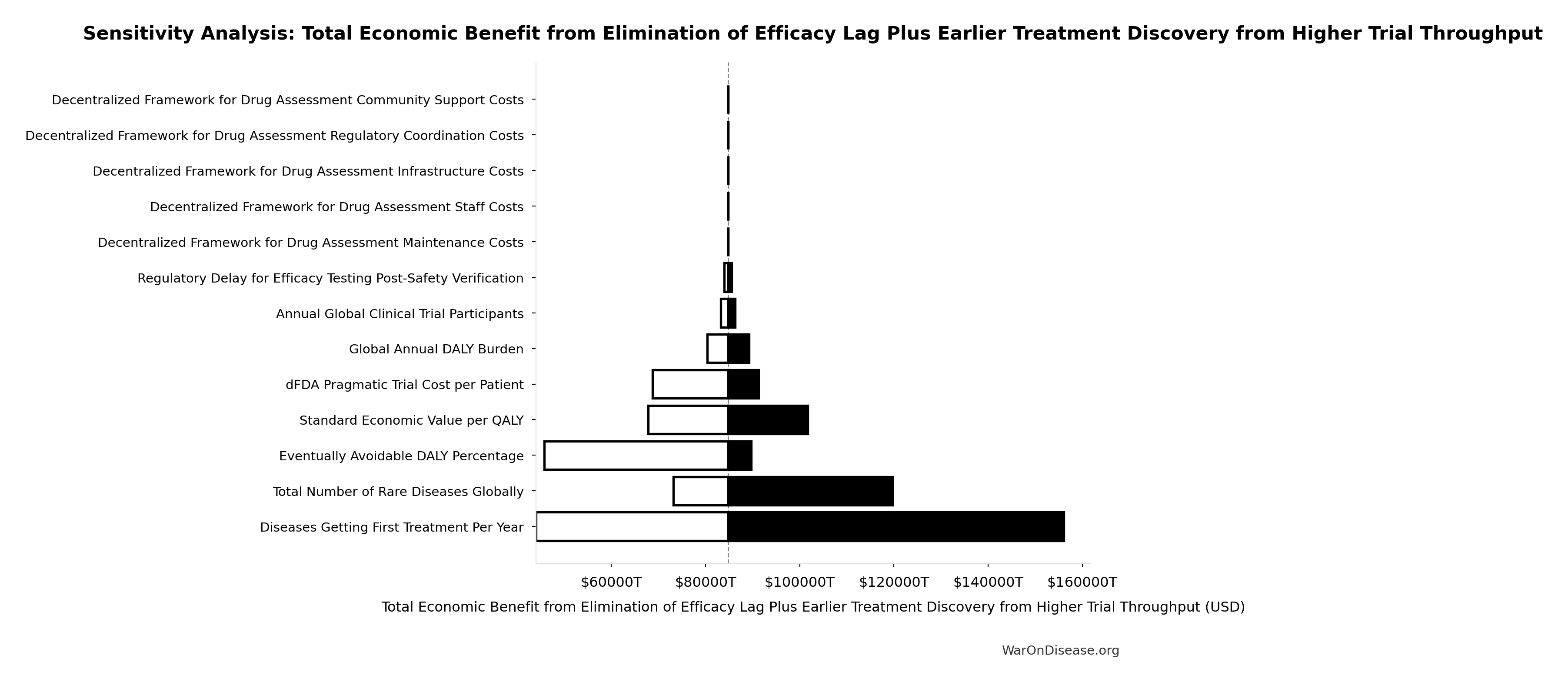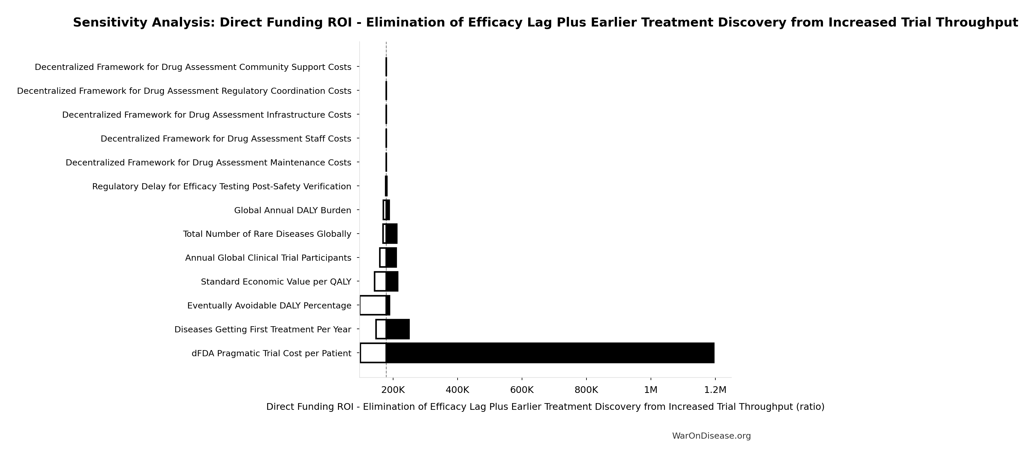 \[ \begin{gathered} Cost_{direct,DALY} \\ = \frac{NPV_{direct}}{DALYs_{max}} \\ = \frac{\$476B}{565B} \\ = \$0.842 \end{gathered} \] where: \[ NPV_{direct} = Funding_{ann} \times \frac{1 - (1+r)^{-T}}{r} \] where: \[ \begin{gathered} T_{queue,dFDA} \\ = \frac{T_{queue,SQ}}{k_{capacity}} \\ = \frac{443}{12.3} \\ = 36 \end{gathered} \] where: \[ \begin{gathered} T_{queue,SQ} \\ = \frac{N_{untreated}}{Treatments_{new,ann}} \\ = \frac{6{,}650}{15} \\ = 443 \end{gathered} \] where: \[ \begin{gathered} N_{untreated} \\ = N_{rare} \times 0.95 \\ = 7{,}000 \times 0.95 \\ = 6{,}650 \end{gathered} \] where: \[ \begin{gathered} k_{capacity} \\ = \frac{N_{fundable,dFDA}}{Slots_{curr}} \\ = \frac{23.4M}{1.9M} \\ = 12.3 \end{gathered} \] where: \[ \begin{gathered} N_{fundable,dFDA} \\ = \frac{Subsidies_{dFDA,ann}}{Cost_{pragmatic,pt}} \\ = \frac{\$21.8B}{\$929} \\ = 23.4M \end{gathered} \] where: \[ \begin{gathered} Subsidies_{dFDA,ann} \\ = Funding_{dFDA,ann} - OPEX_{dFDA} \\ = \$21.8B - \$40M \\ = \$21.8B \end{gathered} \] where: \[ \begin{gathered} OPEX_{dFDA} \\ = Cost_{platform} + Cost_{staff} + Cost_{infra} \\ + Cost_{regulatory} + Cost_{community} \\ = \$15M + \$10M + \$8M + \$5M + \$2M \\ = \$40M \end{gathered} \] where: \[ \begin{gathered} DALYs_{max} \\ = DALYs_{global,ann} \times Pct_{avoid,DALY} \times T_{accel,max} \\ = 2.88B \times 92.6\% \times 212 \\ = 565B \end{gathered} \] where: \[ T_{accel,max} = T_{accel} + T_{lag} = 204 + 8.2 = 212 \] where: \[ \begin{gathered} T_{accel} \\ = T_{first,SQ} \times \left(1 - \frac{1}{k_{capacity}}\right) \\ = 222 \times \left(1 - \frac{1}{12.3}\right) \\ = 204 \end{gathered} \] where: \[ \begin{gathered} T_{first,SQ} \\ = T_{queue,SQ} \times 0.5 \\ = 443 \times 0.5 \\ = 222 \end{gathered} \] ~ Medium confidence