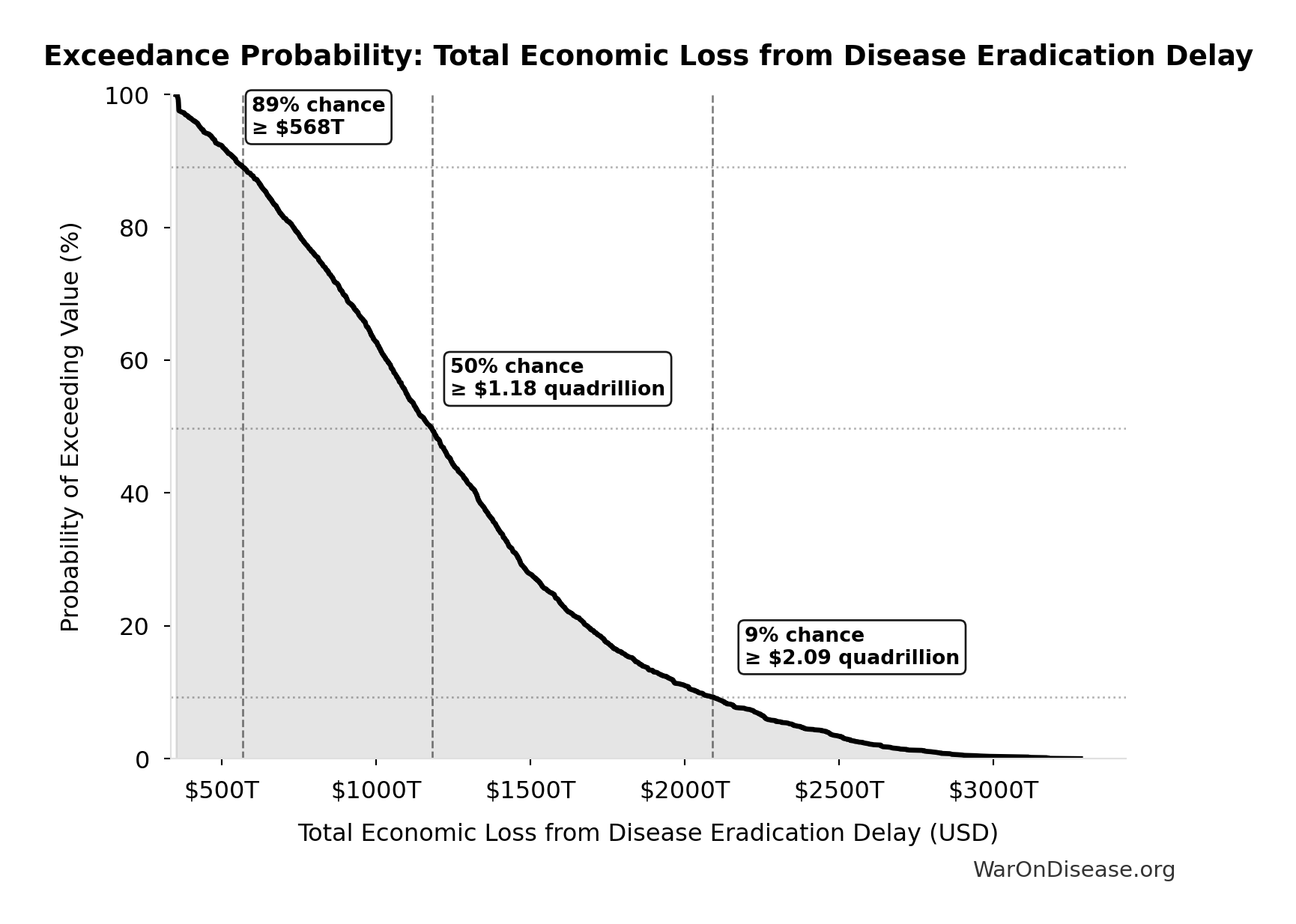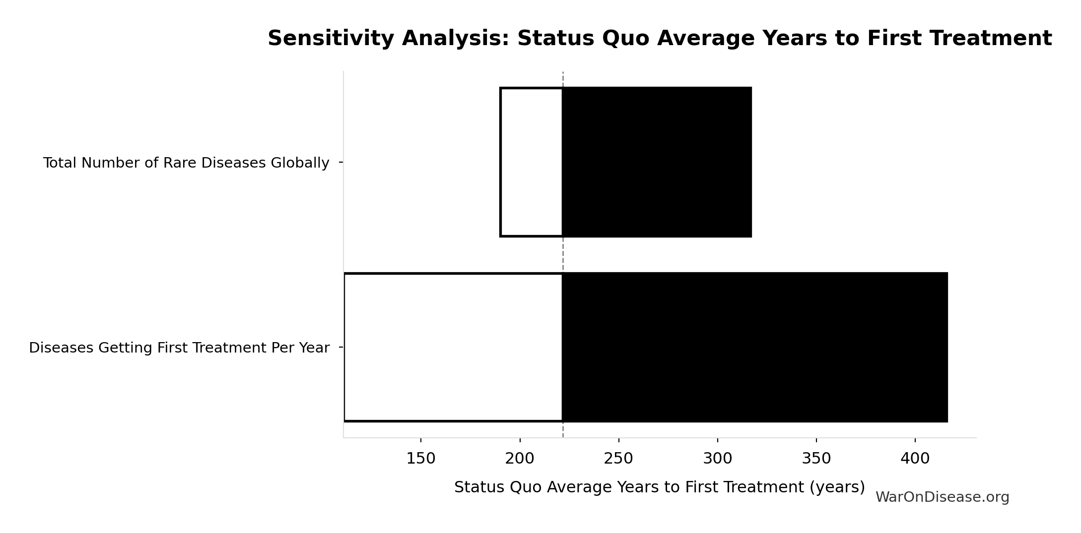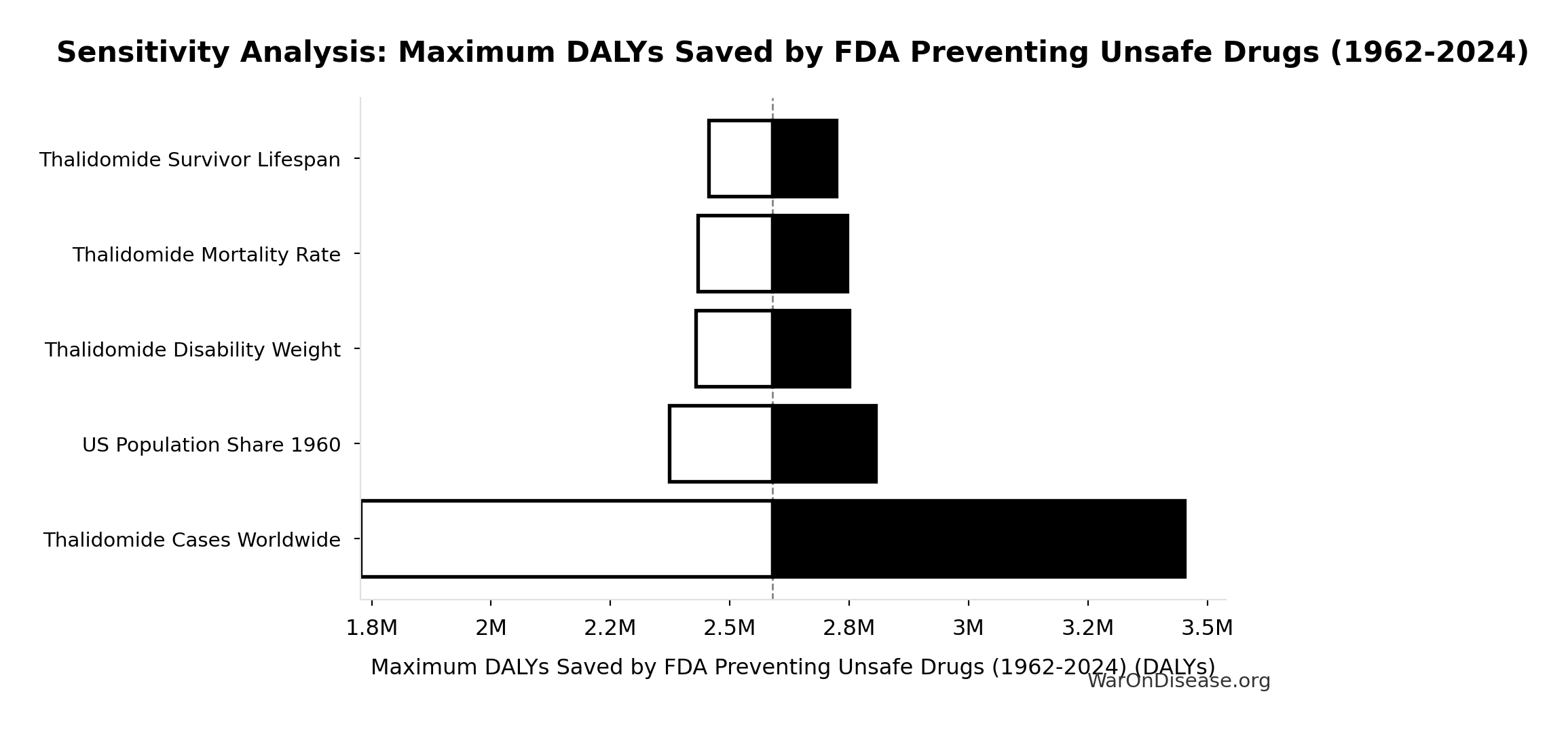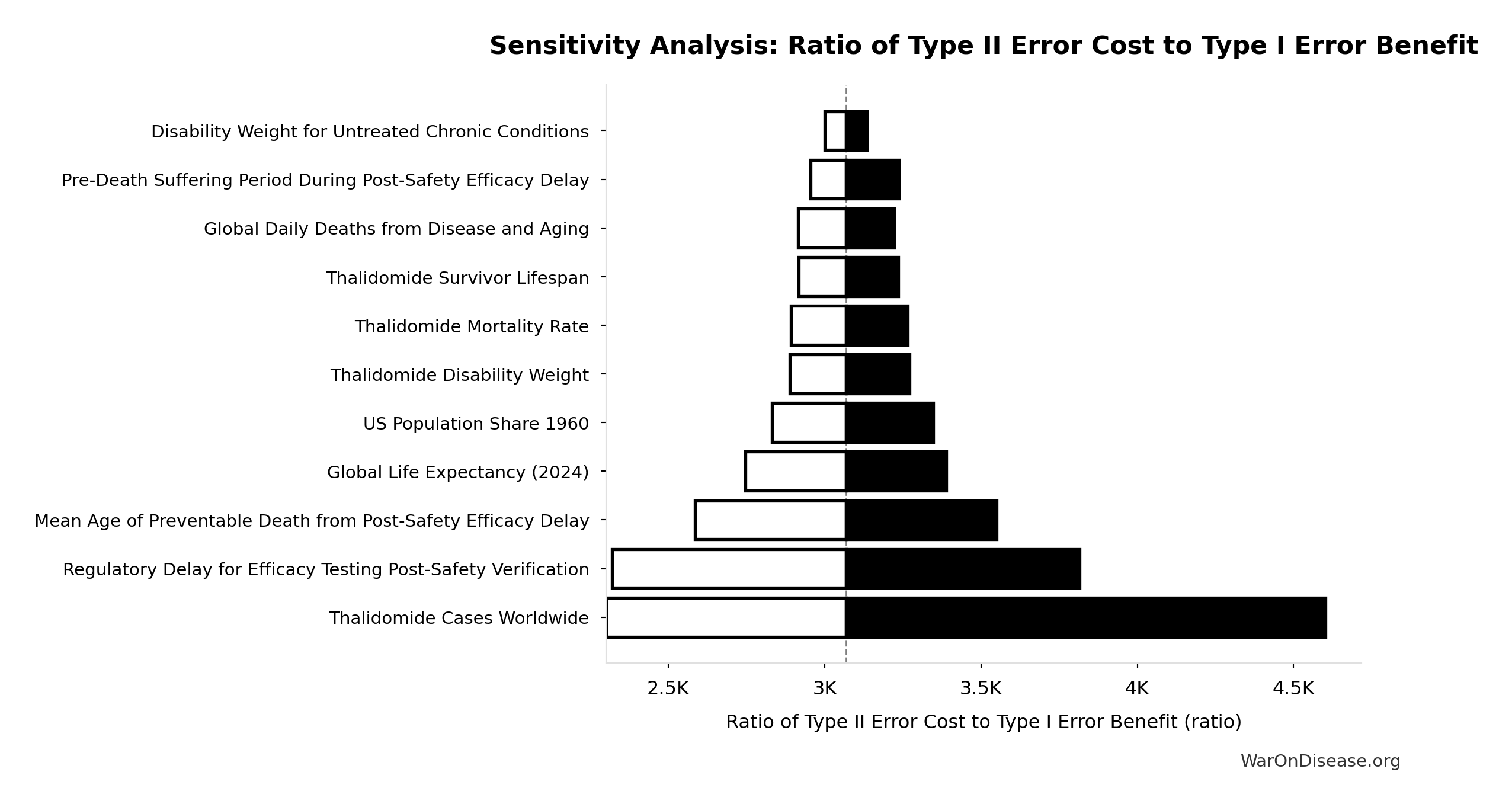 \[ \begin{gathered} Cost_{direct,DALY} \\ = \frac{NPV_{direct}}{DALYs_{max}} \\ = \frac{\$476B}{565B} \\ = \$0.842 \end{gathered} \] where: \[ NPV_{direct} = Funding_{ann} \times \frac{1 - (1+r)^{-T}}{r} \] where: \[ \begin{gathered} T_{queue,dFDA} \\ = \frac{T_{queue,SQ}}{k_{capacity}} \\ = \frac{443}{12.3} \\ = 36 \end{gathered} \] where: \[ \begin{gathered} T_{queue,SQ} \\ = \frac{N_{untreated}}{Treatments_{new,ann}} \\ = \frac{6{,}650}{15} \\ = 443 \end{gathered} \] where: \[ \begin{gathered} N_{untreated} \\ = N_{rare} \times 0.95 \\ = 7{,}000 \times 0.95 \\ = 6{,}650 \end{gathered} \] where: \[ \begin{gathered} k_{capacity} \\ = \frac{N_{fundable,dFDA}}{Slots_{curr}} \\ = \frac{23.4M}{1.9M} \\ = 12.3 \end{gathered} \] where: \[ \begin{gathered} N_{fundable,dFDA} \\ = \frac{Subsidies_{dFDA,ann}}{Cost_{pragmatic,pt}} \\ = \frac{\$21.8B}{\$929} \\ = 23.4M \end{gathered} \] where: \[ \begin{gathered} Subsidies_{dFDA,ann} \\ = Funding_{dFDA,ann} - OPEX_{dFDA} \\ = \$21.8B - \$40M \\ = \$21.8B \end{gathered} \] where: \[ \begin{gathered} OPEX_{dFDA} \\ = Cost_{platform} + Cost_{staff} + Cost_{infra} \\ + Cost_{regulatory} + Cost_{community} \\ = \$15M + \$10M + \$8M + \$5M + \$2M \\ = \$40M \end{gathered} \] where: \[ \begin{gathered} DALYs_{max} \\ = DALYs_{global,ann} \times Pct_{avoid,DALY} \times T_{accel,max} \\ = 2.88B \times 92.6\% \times 212 \\ = 565B \end{gathered} \] where: \[ T_{accel,max} = T_{accel} + T_{lag} = 204 + 8.2 = 212 \] where: \[ \begin{gathered} T_{accel} \\ = T_{first,SQ} \times \left(1 - \frac{1}{k_{capacity}}\right) \\ = 222 \times \left(1 - \frac{1}{12.3}\right) \\ = 204 \end{gathered} \] where: \[ \begin{gathered} T_{first,SQ} \\ = T_{queue,SQ} \times 0.5 \\ = 443 \times 0.5 \\ = 222 \end{gathered} \] ~ Medium confidence