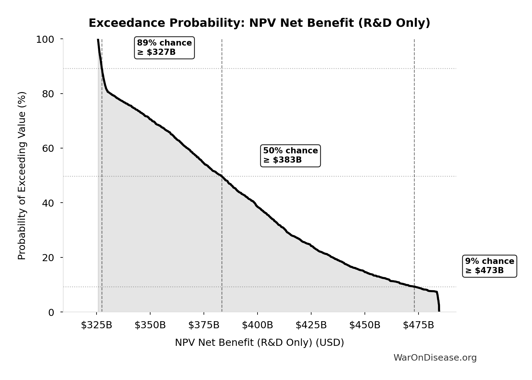 This exceedance probability chart shows the likelihood that Decentralized Framework for Drug Assessment Annual Benefit: R&D Savings will exceed any given threshold. Higher curves indicate more favorable outcomes with greater certainty.