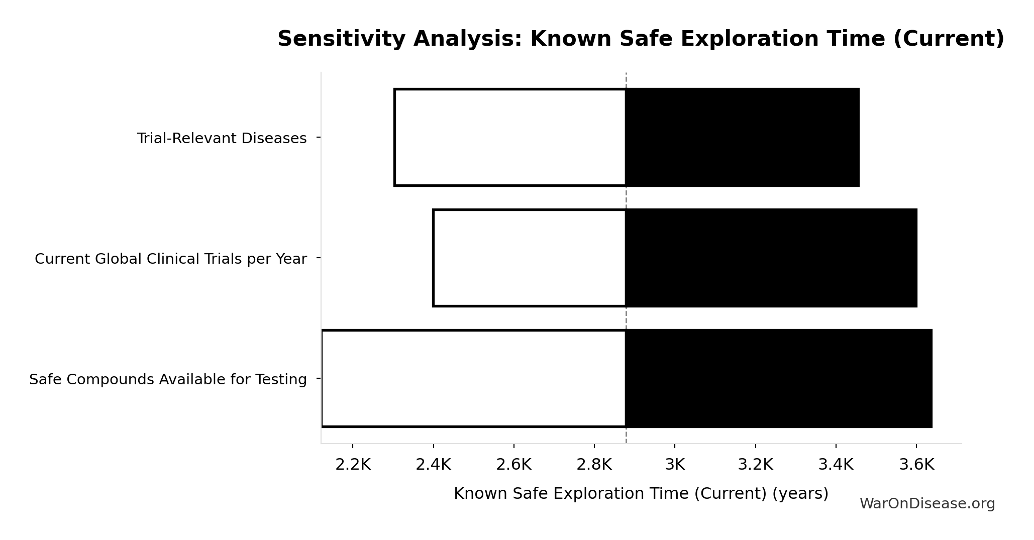 \[ \begin{gathered} T_{explore,safe} \\ = \frac{N_{combos}}{Trials_{ann,curr}} \\ = \frac{9.5M}{3{,}300} \\ = 2{,}880 \end{gathered} \] where: \[ \begin{gathered} N_{combos} \\ = N_{safe} \times N_{diseases,trial} \\ = 9{,}500 \times 1{,}000 \\ = 9.5M \end{gathered} \] ✓ High confidence
